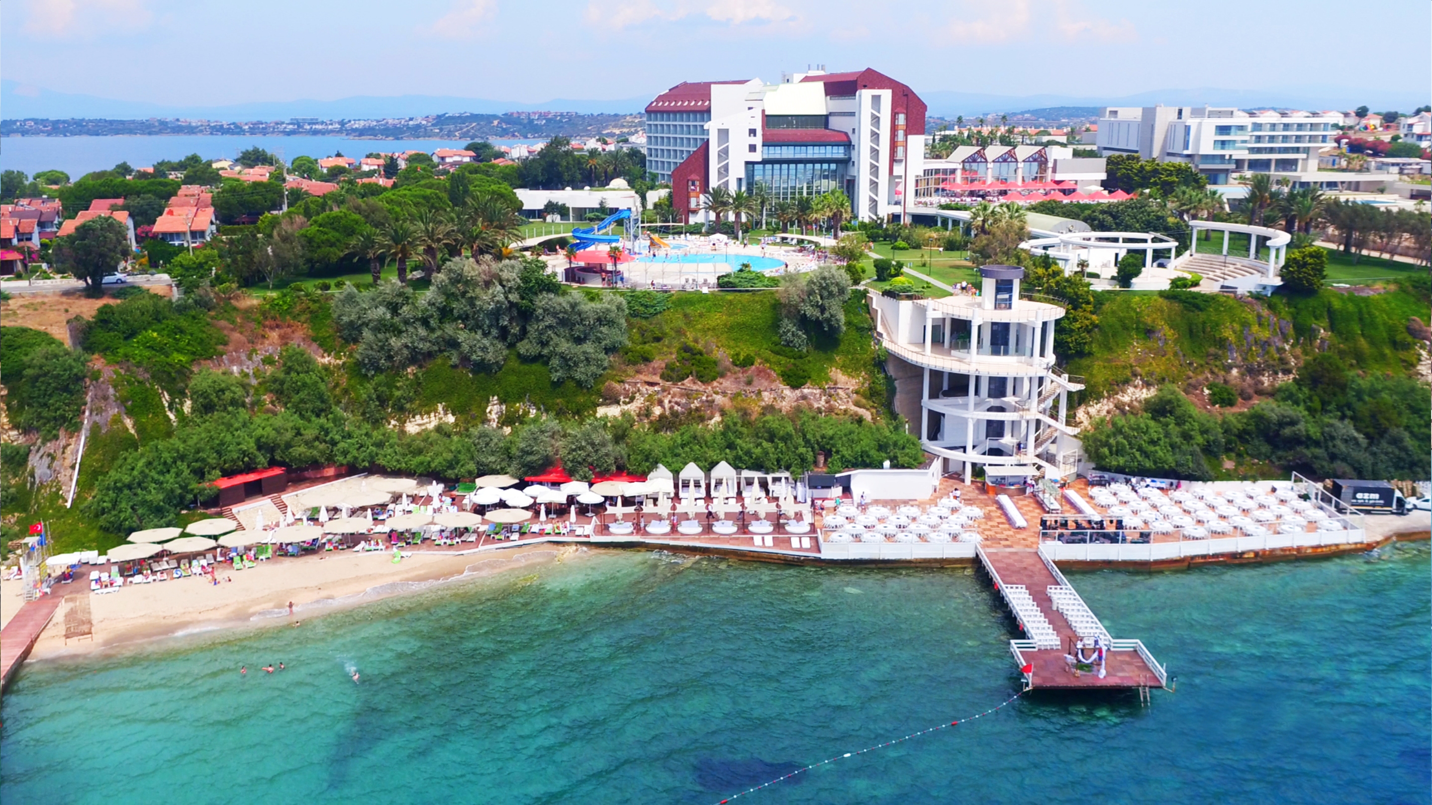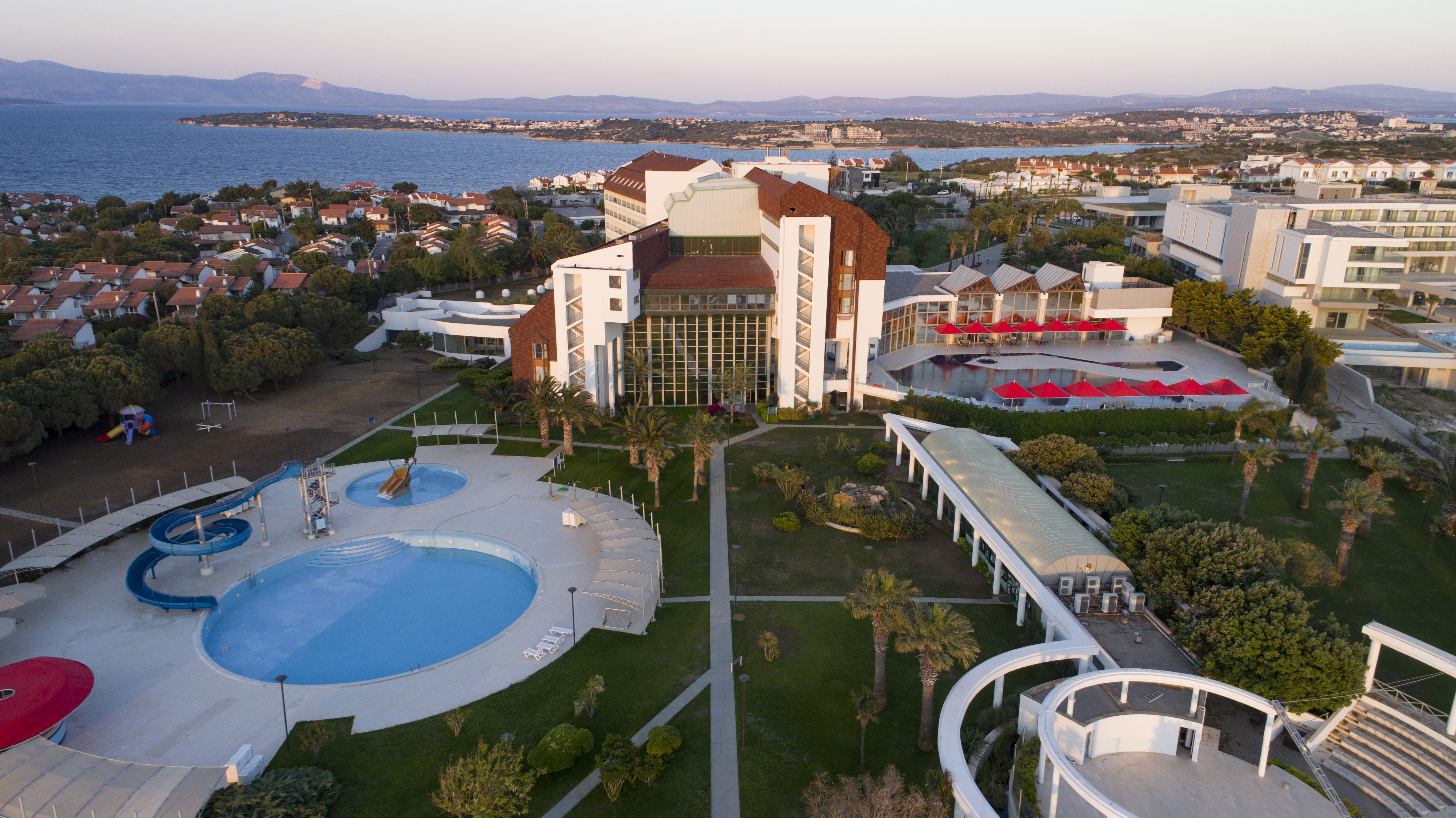 This exclusive luxury hotel enjoys an idyllic location with a great view of the Aegean Sea and the Greek island of Chios. Dalyan is around 4 km from the hotel, whilst Cesme is just 6 km away. Here guests will find plenty of shopping and entertainment venues. Transfer to Izmir airport takes about 90 minutes by car. This luxury hotel offers first-rate facilities. It was renovated in 2005 and comprises 8 floors. Special features of this hotel include a cosy bar and a restaurant, which is particularly inviting with its delicious and unique cuisine. The hotel is ideal for business guests, since on-site amenities also include a conference room with Internet access. In the well-tended grounds, guests will find a swimming pool with a children's paddling area. Use of the wide range of health treatments, like the sauna, the steam baths and massage service, is also available.