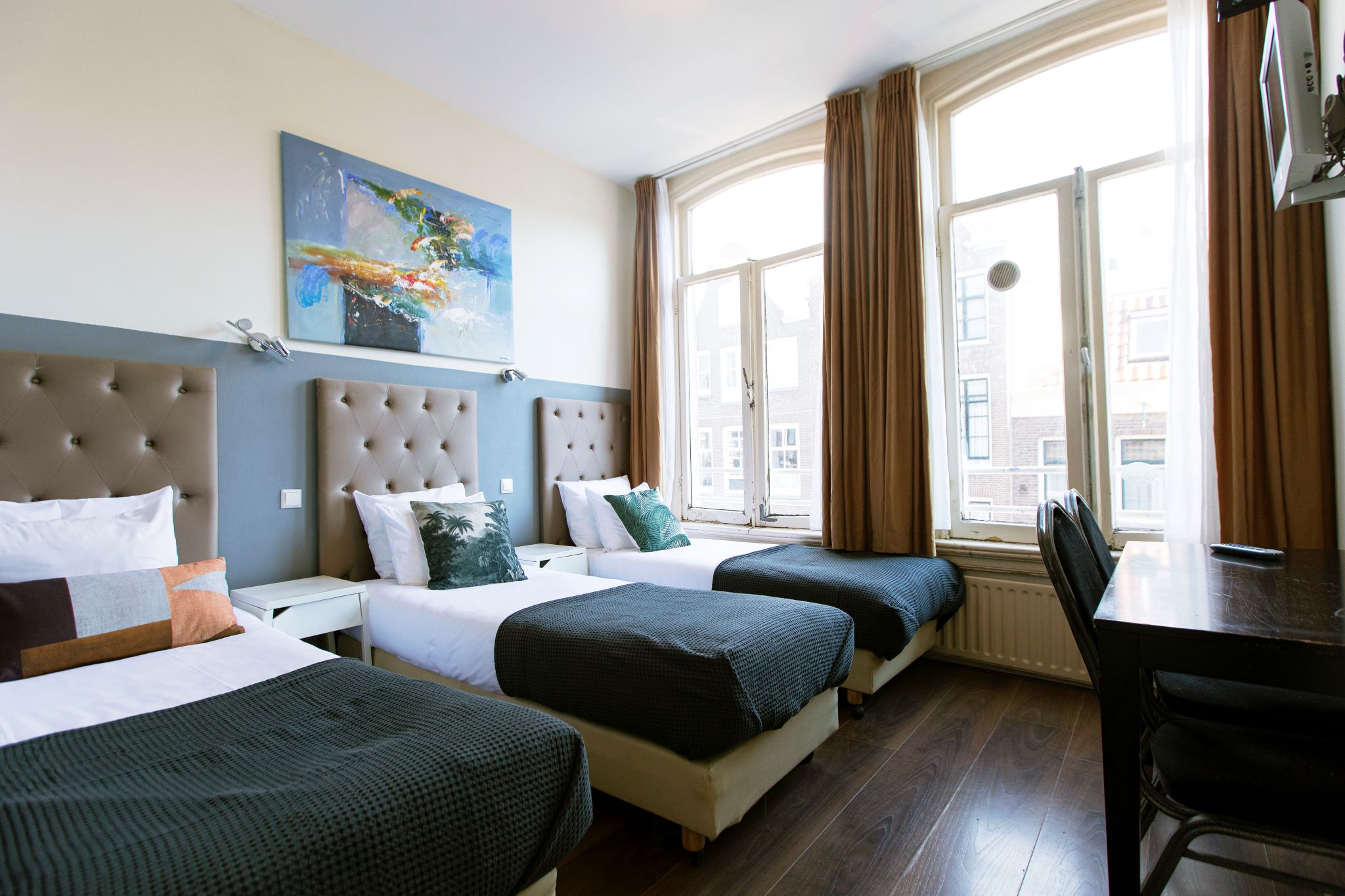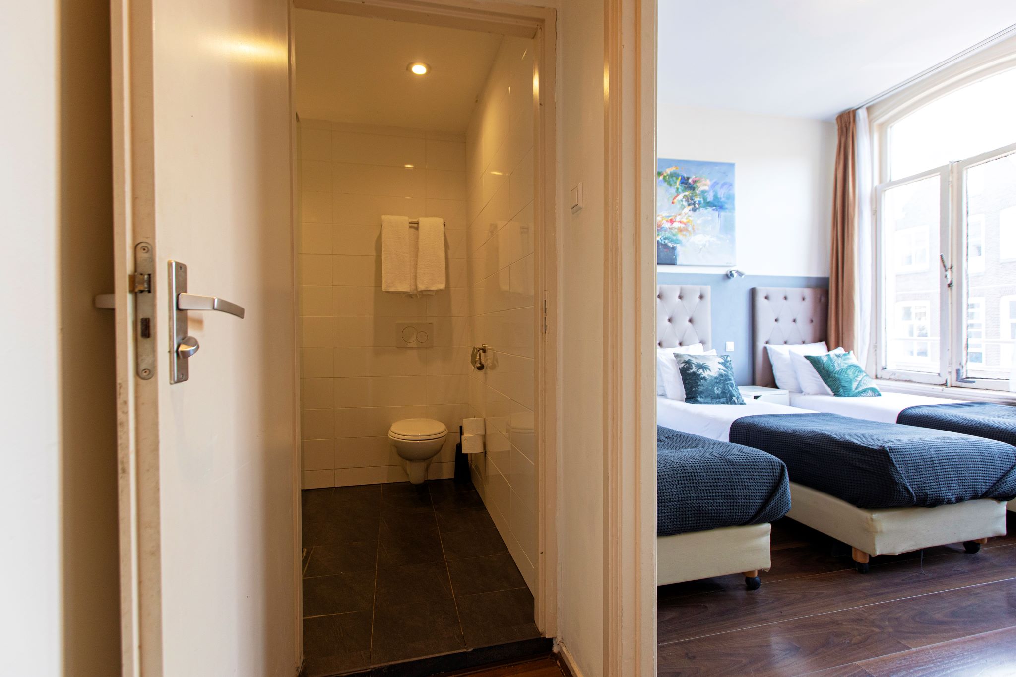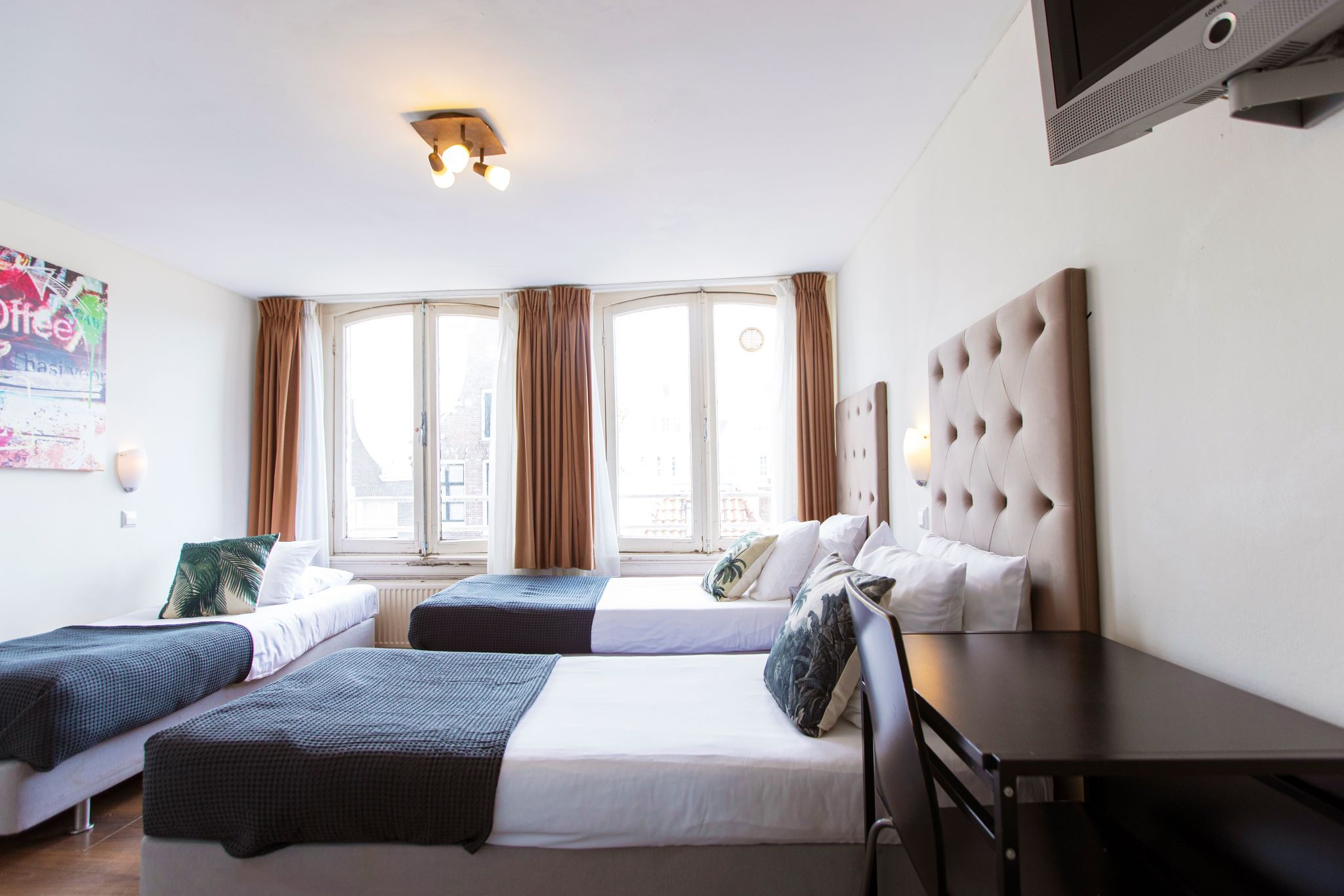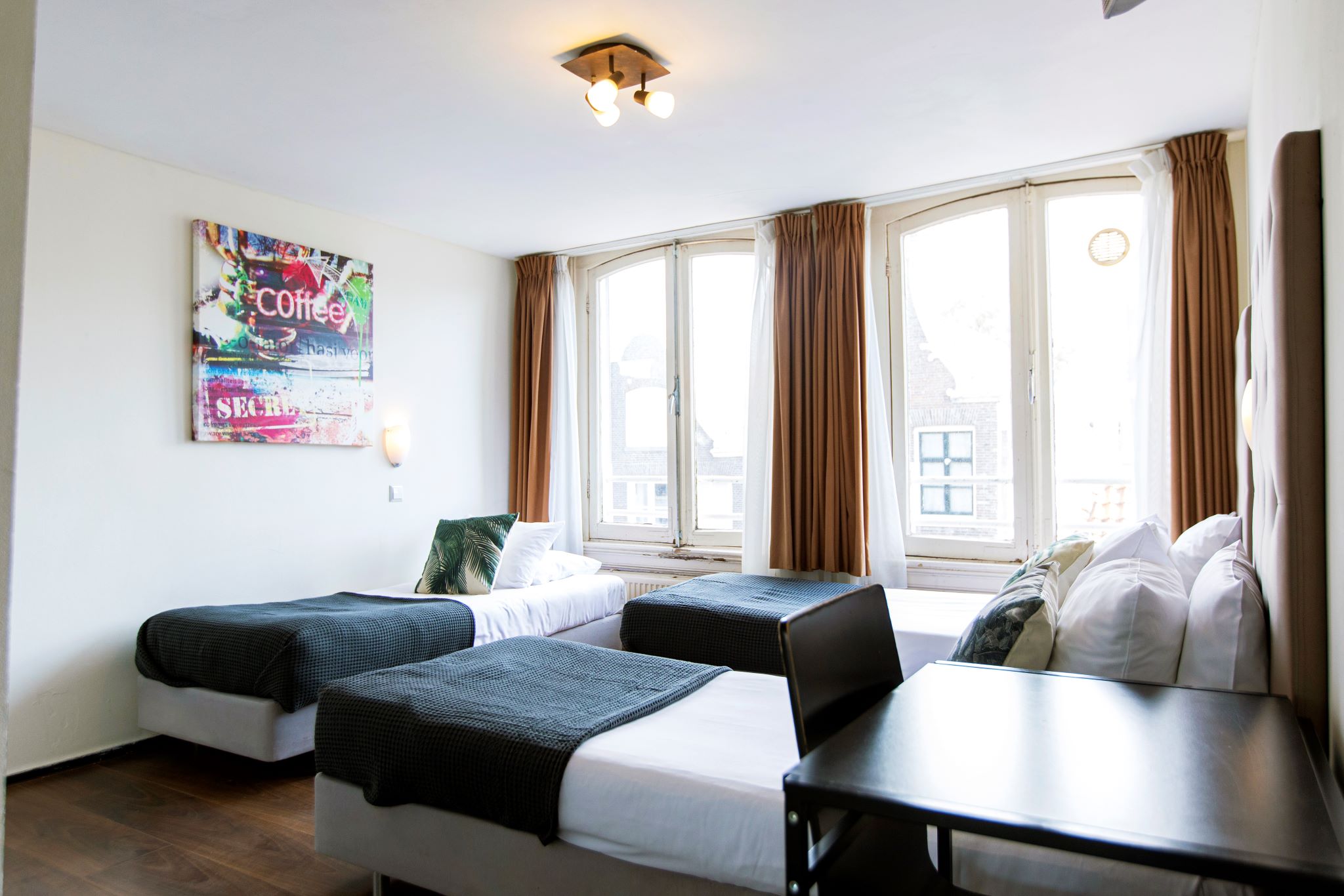 The Quentin Arrive is a comfortable hotel, offering 34 rooms. It is located in a beautiful 19th century building, across the street from Amsterdam Central Station, in the middle of a 630-year-old street which offers a variety of restaurants, bars and cafés right outside the hotel door. The location of the Quentin Arrive gives you the opportunity to discover almost all of Amsterdam's hot spots, within walking distance. Dam square, the heart of Amsterdam, can be reached from the Quentin Arrive easily in less than 7 minutes walking, presenting some of the city's greatest attractions: The Royal Palace 011 Dam Square, Madam Tussaud's Museum, The Dam Monument, and of course The Red Light District, the most famous district in the world. The Quentin Arrive offers you Single rooms up to rooms for 4 people with private or shared all at reasonable prices, and most important: friendly staff that will make sure your Amsterdam experience will be an unforgettable one. All the rooms have shared facilities, except triple rooms. Free WiFi