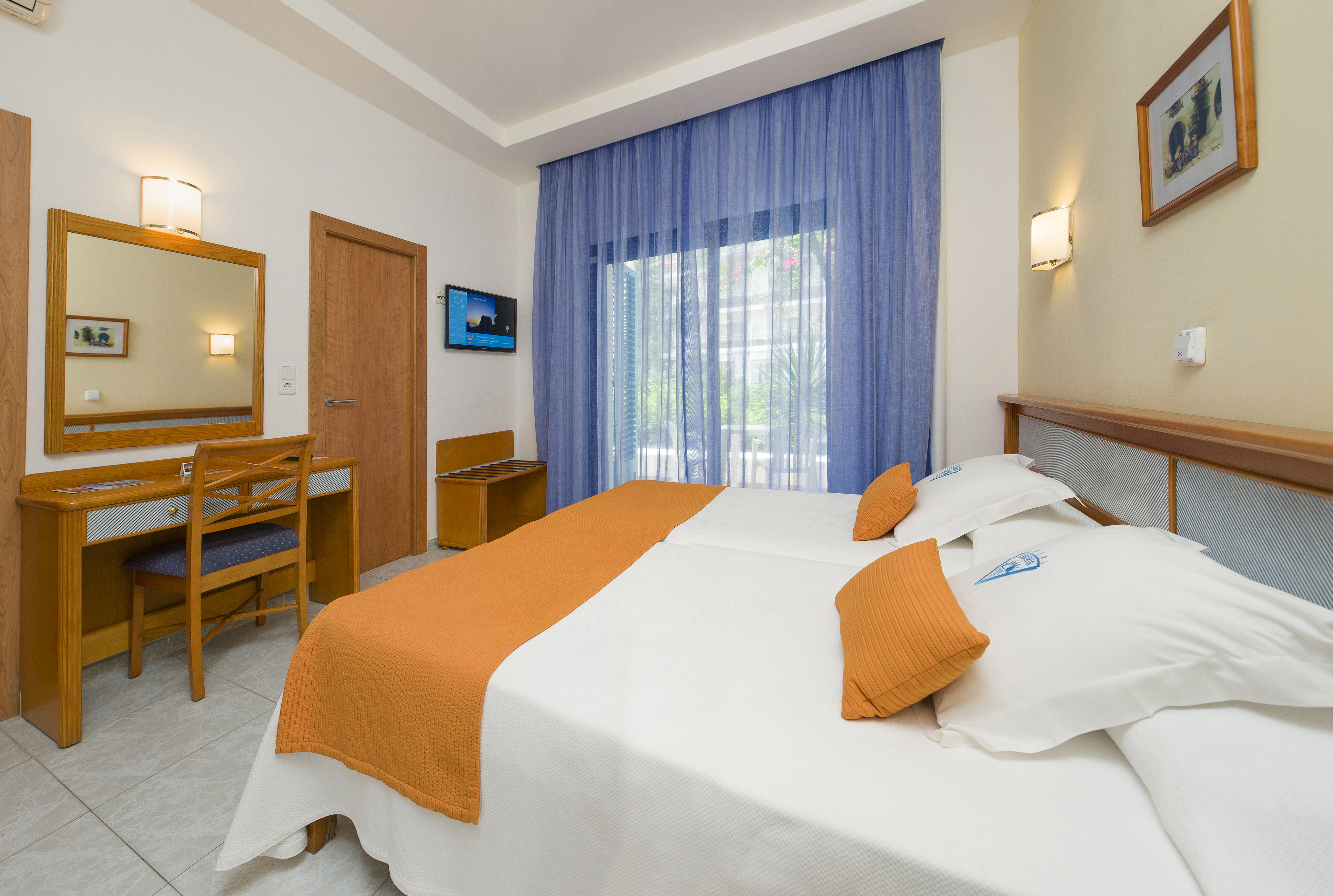 Family managed hotel renovated in 2014, recomended for couples looking for a quiet hotel, this hotel consists of a 3-storey building with a total of 97 hotel rooms , available single, twin and double rooms. Facilities include a lobby with a 24-hour reception desk, safe deposit boxes . There is also a bar, a lounge, TV room, a small supermarket and an air-conditioned buffet style restaurant with highchairs for infants available. In addition, the hotel offers free WiFi for hotel guest, laundry service as well as a bicycle hire service (charges apply) also a nice solarium terrace with a swiming pool, there is a tennis court, a gym and a sand volleyball court.
