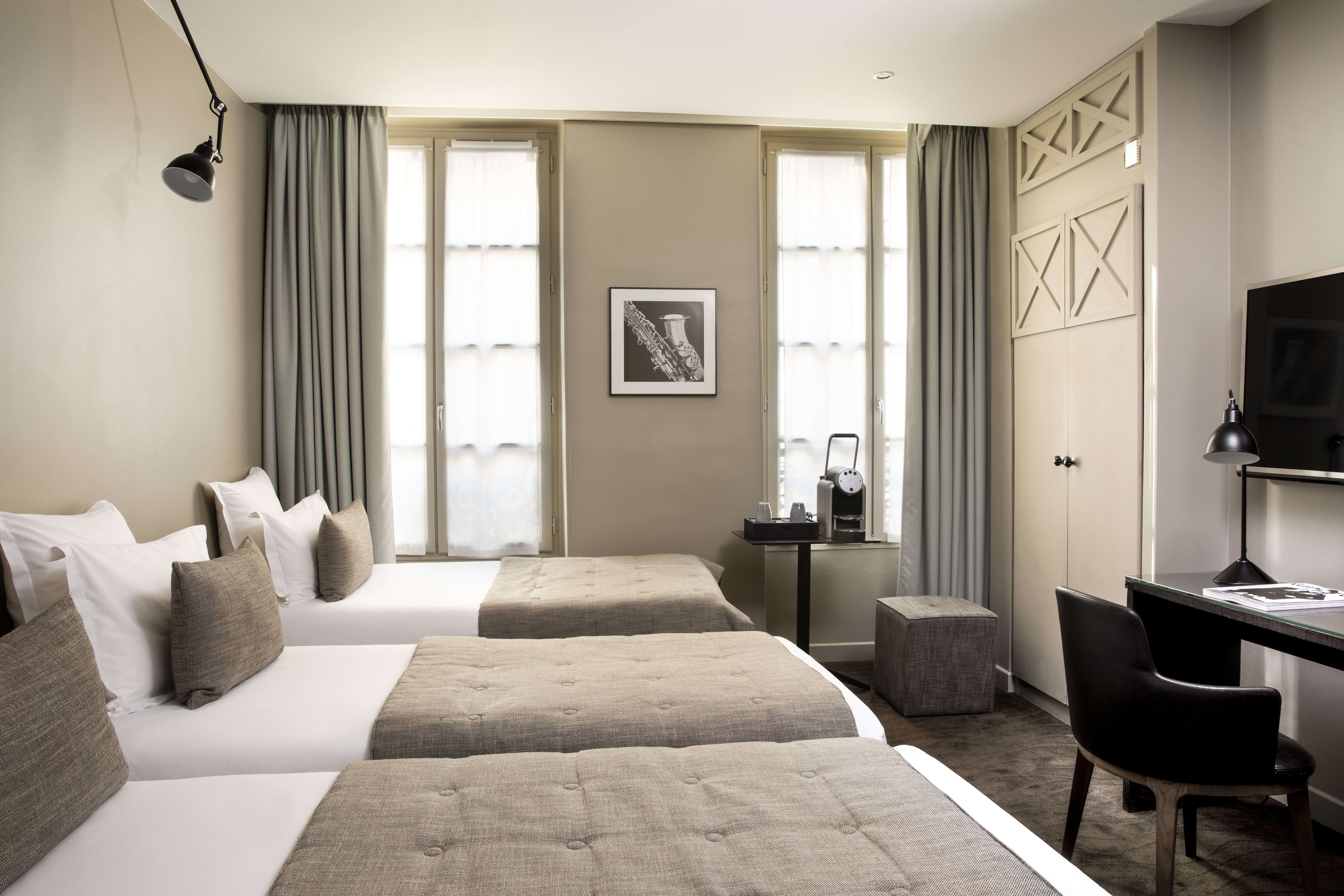In the heart of the Opera Garnier district, the hotel enjoys an exceptional location for leisure and shopping, just minutes from the Place de la Madeleine. The location invites guests to stroll along the big department stores such as Galeries Lafayette on Boulevard Haussmann. There are restaurants, bars and nightlife spots in the immediate vicinity, while the Mogador Theatre is 100 metres away and Place Vendome is around 400 metres away. The air-conditioned city hotel offers 42 rooms in total and combines high-end facilities with elegant décor featuring exotic wood furniture and brightly coloured wall coverings. The hotel will delight guests with its comfortable rooms and suites which are beautifully decorated in a chic Art Deco style. Each unit features an en-suite bathroom with toiletries, a double bed with champagne-coloured duvets, climate control, and a private balcony or terrace.